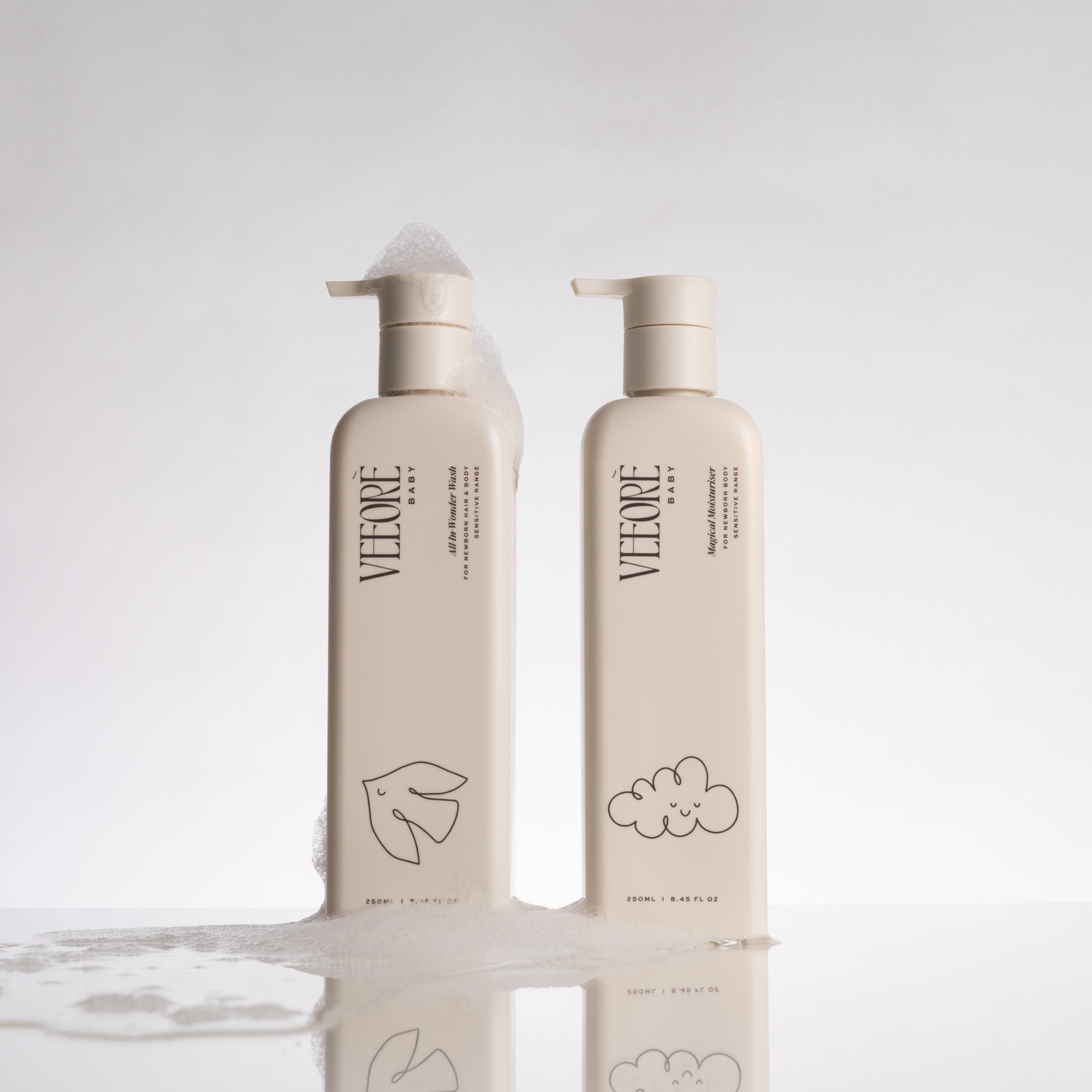 1 - Carefully cleanse your little one from head to toe with our gentle, soap-free Veeoré All-In-Wonder Wash