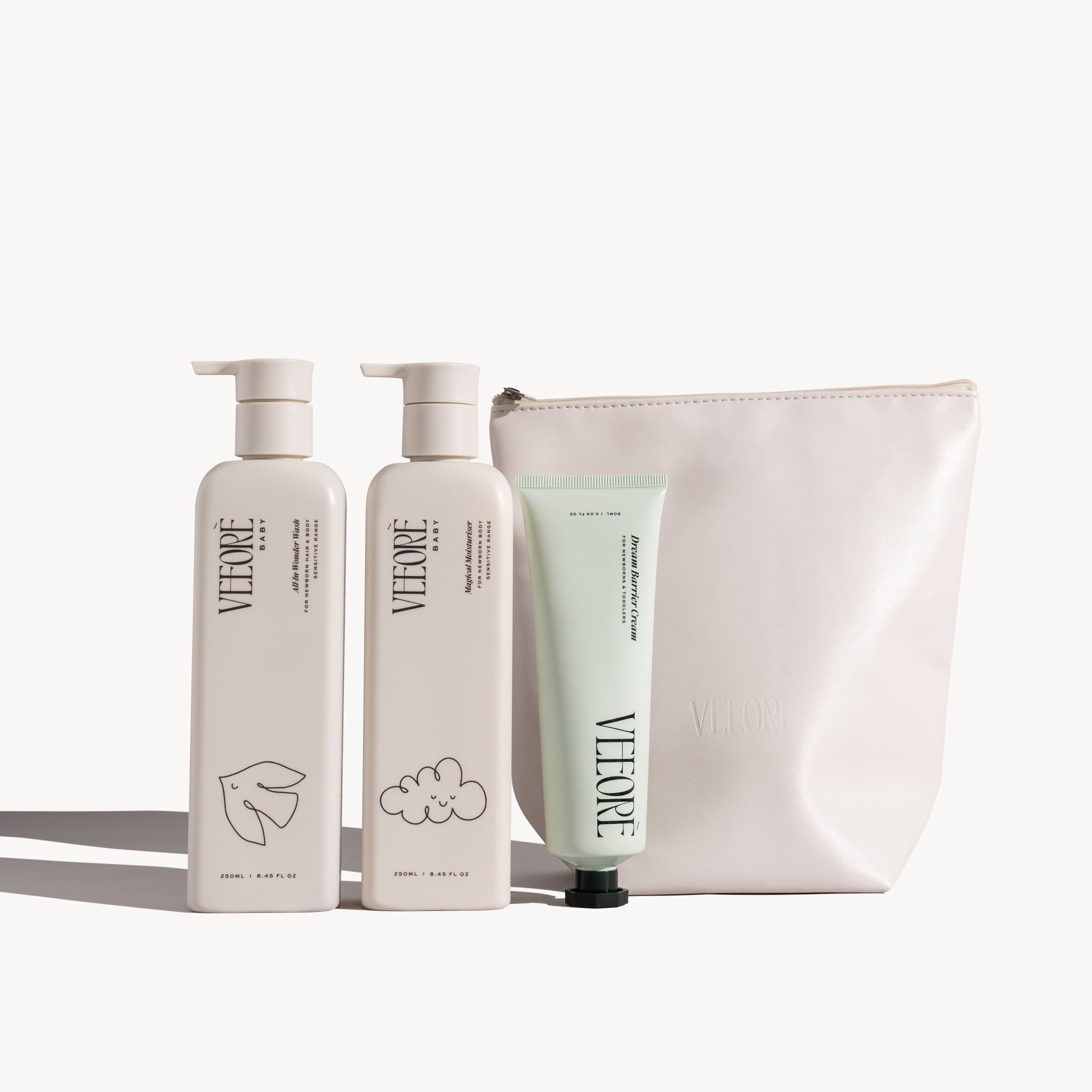 Crafted with science-backed care, our Full-Size Bundle offers everything needed to cleanse, soothe, and nourish your baby’s delicate skin in one thoughtfully curated set. Filled with three essentials and a large travel bag—perfect for your little one and you. Each product is dermatologist-tested, made with Veeorè’s signature aloe-based hydration, and infused with our unique trio-ceramides to support baby’s natural skin barrier. Perfect for keeping your little one’s skin soft, balanced, and protected, this bundle is an ideal introduction to gentle, effective baby skincare.